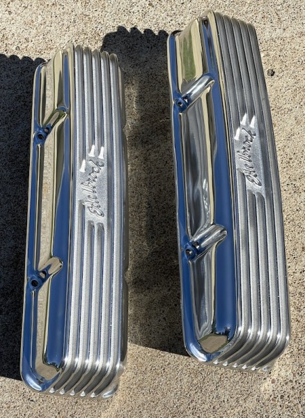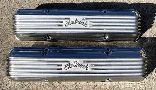 1pr. Show Polished — Cast Aluminum - Straight Finned Top Valve Covers with Edelbrock logo